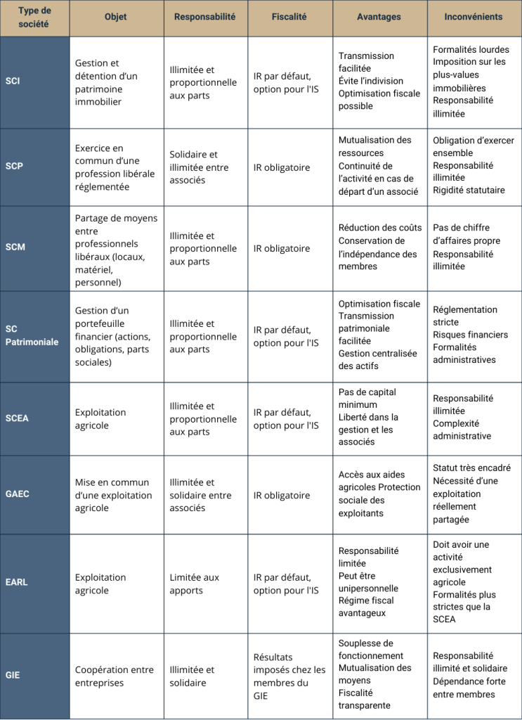 Voici un tableau comparatif des principales formes de sociétés civiles :